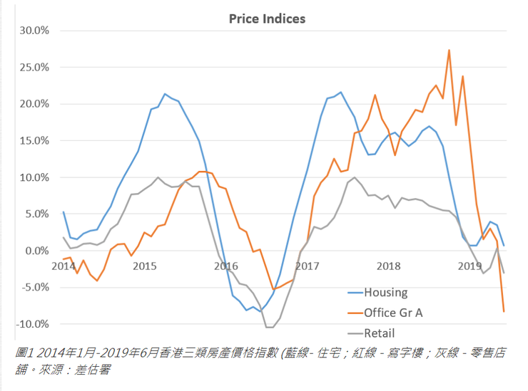 2017年我在立法會向官員警告有關甲級寫字樓的空置率上升至接近雙位數,價格可能受壓;2019年5月撰文指出香港的寫字樓價格指數在2月份已出現大約-5%的下跌;2019年8月再警告6月份的跌幅已跌至-8.3%!(姚,2019) 這數字只反映未出現反送中運動前的甲級寫字樓價格年度跌幅,我已預測房產價格將會進一步下跌: