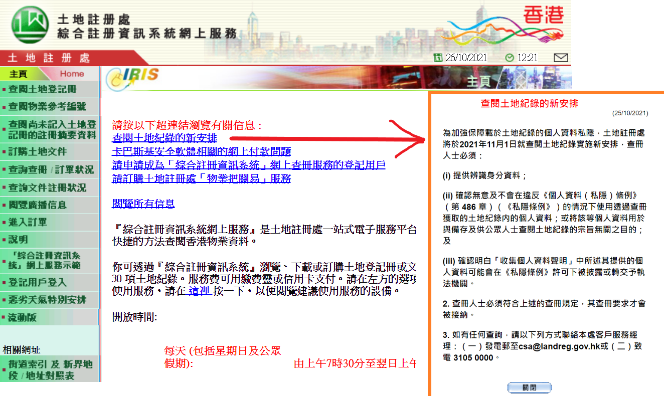 土地注册处载有所有土地和楼宇买卖人的个人资料,处方声称为了保障私隐,由下月1日起,查阅土地纪录者须提供辨识身分资料,例如姓名及身分证明文件编号,并确认无意及不会在违反《个人资料(私隐)条例》的情况下使用查册所得资料,亦不会将该等资料备存及让公众以与「纪录宗旨无关之目的」去查阅。另外,查册者必须符合查册规定,其查册申请才会被接纳,例如该处备存土地登记资料供市民查阅,目的是防止秘密及有欺诈成分的物业转易,及提供容易追溯和确定土地财产及不动产业权的方法。