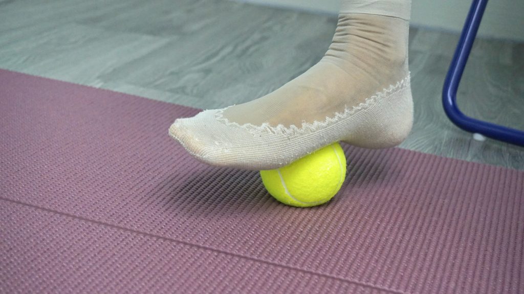 方法:腳掌踏網球,然後讓網球在腳掌前後來回滾動30秒至2分鐘。長者做這個動作時,網球向前壓至腳拇趾下的肌肉,向後壓至腳眼之下即可。