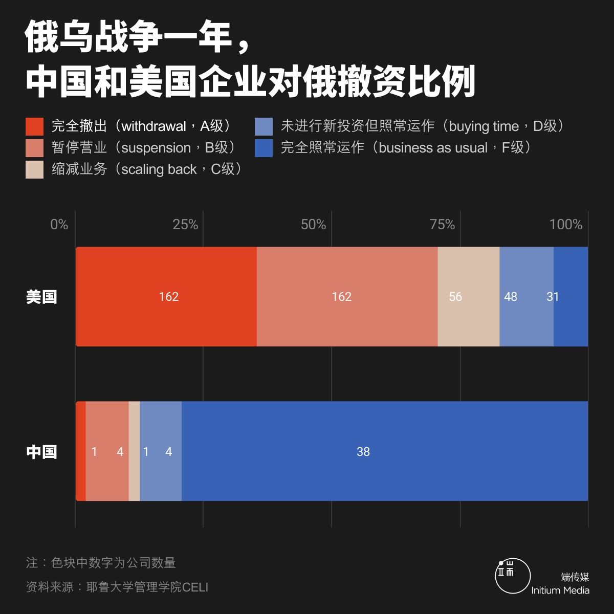 但以上四个国家的企业,都是以进入A至C级的居多,中国大陆的企业相比之下,就形成了一道独特的风景:在52家CELI追踪的中国企业中,只有力帆摩托车完全切断了在俄罗斯的业务(A级)﹑另外有六家企业缩减了在俄业务(大部份是银行,包括中国银行﹑工商银行),落入B或C级,但绝大部份中国企业都落入了D或F级。华为﹑小米﹑中国银联等在俄正常运作,2022年中,克里姆林宫的喉舌《俄罗斯卫星通讯社》(Sputnik)就指出,随著三星和苹果向俄减少供应,小米在俄的市场份额比开战前高出近5个百分点,高踞俄罗斯智能手机排行榜的第一位。而大陆科技业巨头阿里巴巴(Alibaba)和腾讯(Tencent)都在俄罗斯正常营业,而腾讯更被指大笔投资“俄罗斯脸书”VK公司。VK本来在伦敦交易所上市,但在2022年3月已经被终止股市交易。