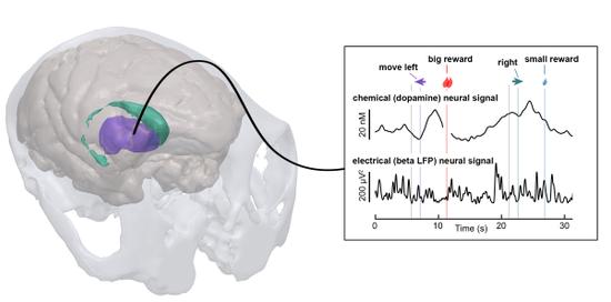 在被下了稱為 Raclopride 的藥後,由於它會關掉捕捉多巴胺的接收器,因此多巴胺會一直被製造,比平常多上許多,讓被電嗨的細胞更嗨,首先長期跟短期記錄電極量到的暴風式成長相當,電一下增加跟 149% up 好浮誇,更重要的是,經過數天確實能持續記錄,雖然仍然有變糟的趨勢,但已經比以前好多了!除了下藥跟電腦外,正常的行為當然也能被記錄,恆河猴在獲得糖水獎勵、甜馬鈴薯,或驚喜後的多巴胺躍升也很確實得被捕捉了下來。