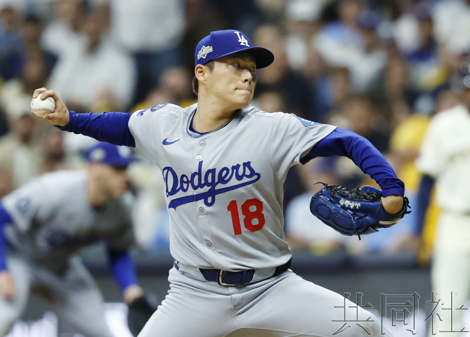 美职棒国联冠军系列赛第二战,道奇队山本由伸客场对阵酿酒人队时拿下胜投。摄于10月14日。(共同社)