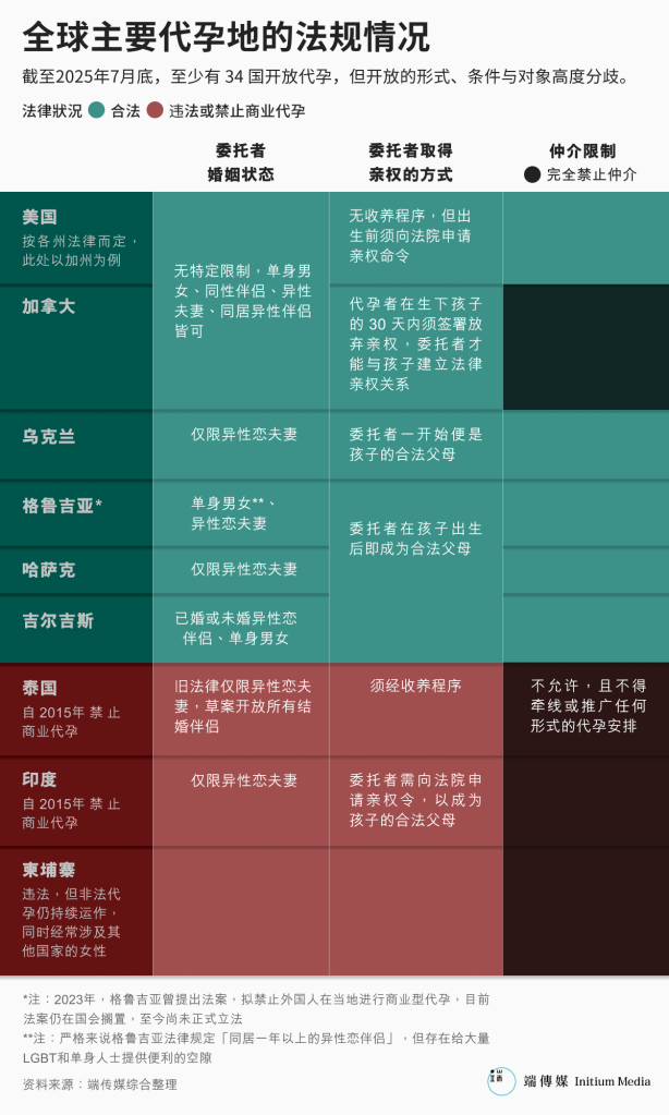 根据端传媒的不完全统计,截至 2025 年 7 月底,全球至少有 34 国立法开放代孕,但开放的形式、条件与对象仍高度分歧。以下为几个主要代孕地的法规情况。