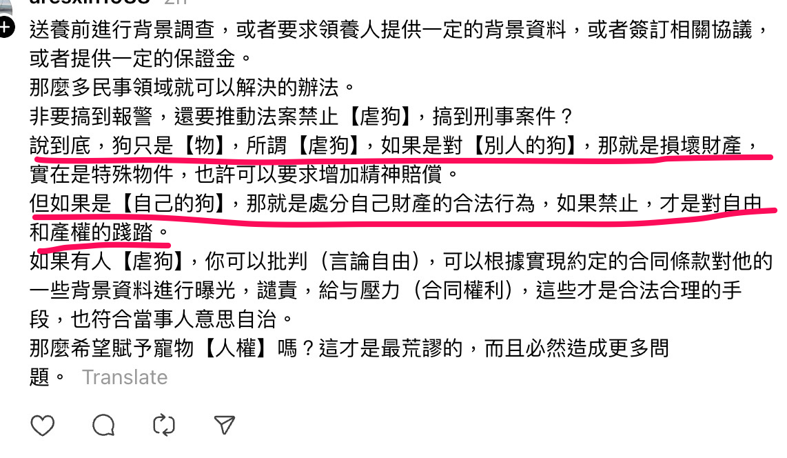 這種似是而非的論點,已成功影響了一些台灣年輕人,這就是為何網上的禁餵軍、恢復12夜的訴求,甚至是相關提案,都缺乏解決根本問題的配套。從踐踏流浪動物開始,到有一天當老百姓也被踐踏時,就會覺得理所當然,寵物只是可以任意處置的所有物,做為奴才的你當然也是,這就是小粉紅雷打不動都要跟黨走的原因。