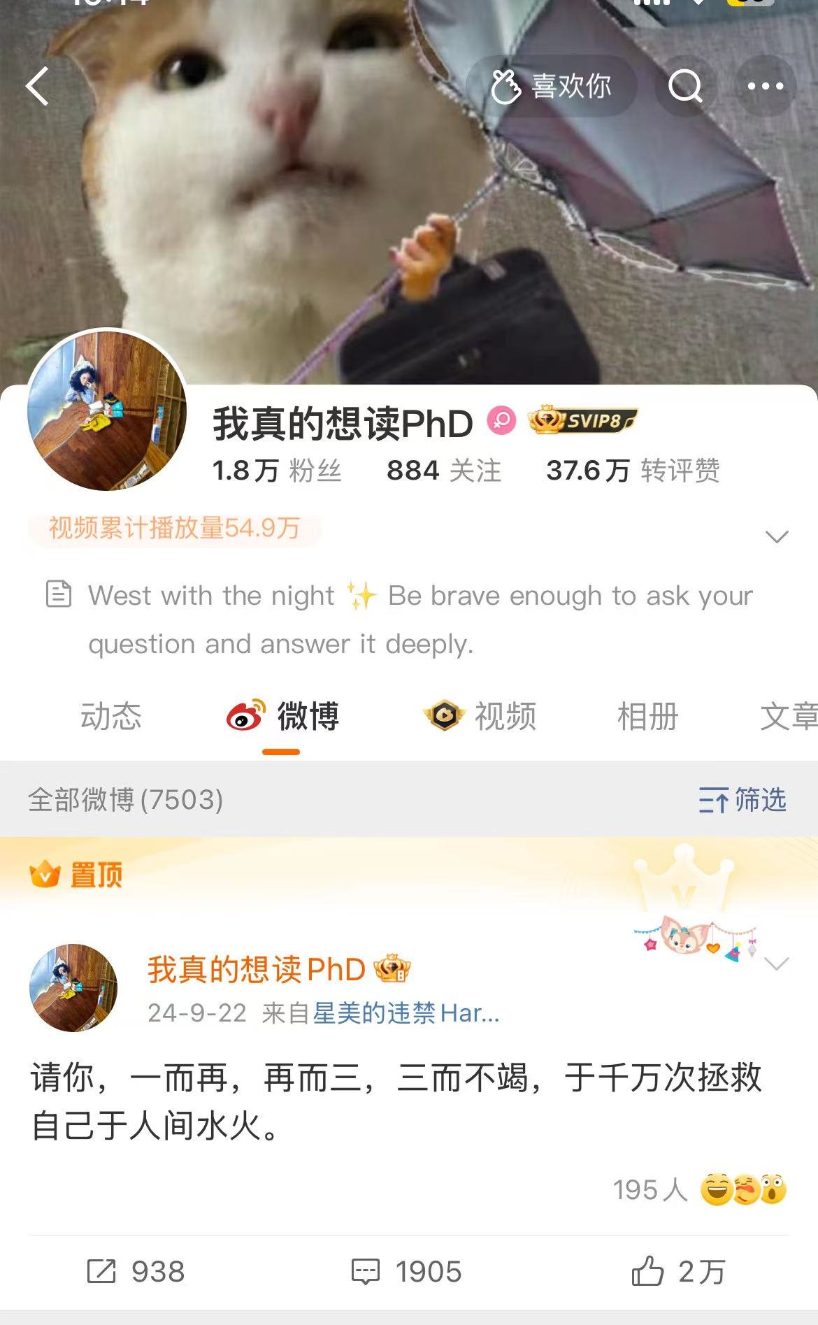 在自己微博上,她置顶了一条自己一年前说的一句话:“请你,一而再,再而三,三而不竭,于千万次拯救自己于人间水火。”这应该是她的真心话,这个看起来内心相当脆弱的人,却又奇异般地有着非常坚韧顽强的一面,这样一个人,只要能扛过打击,完全有可能蜕变重生。