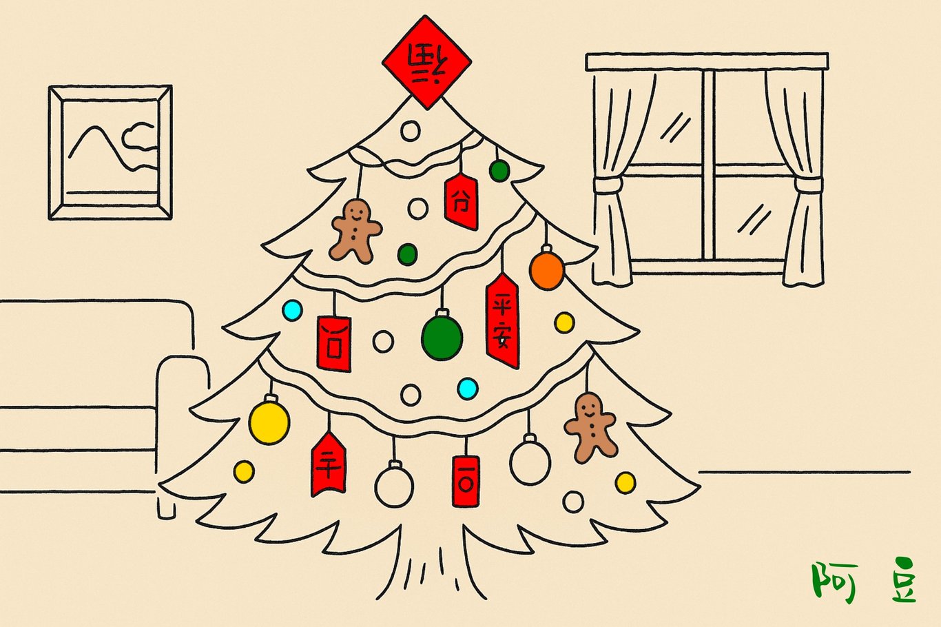 中西合璧的裝飾竟有種荒誕的和諧感,蝦妹拍照片發群組,配文:"我家今年的聖誕文風。"