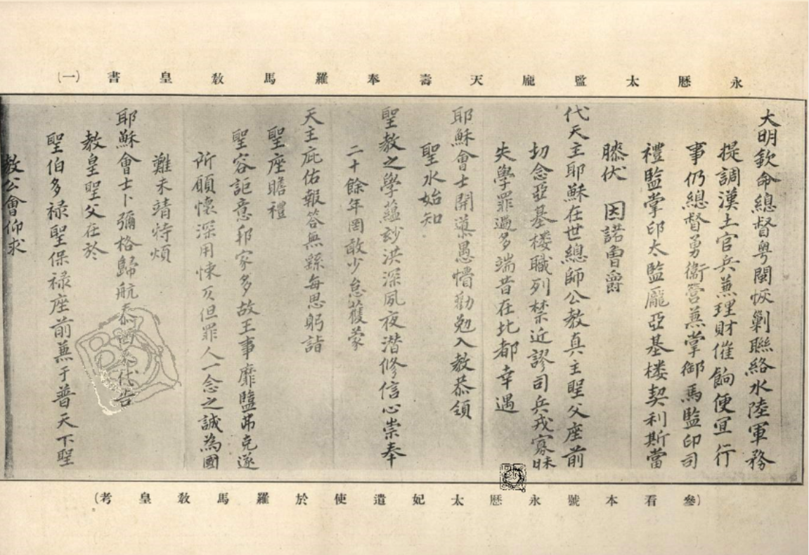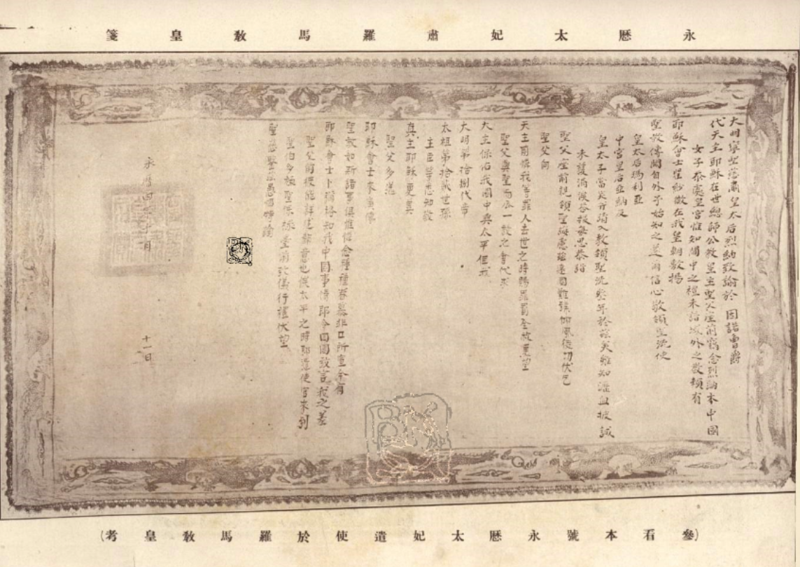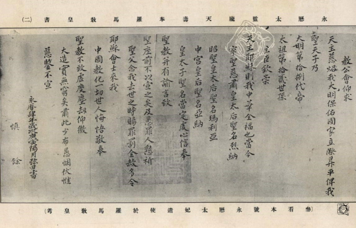 既然外廷礙於面子而不能請求夷人,那麼由後宮以謁見羅馬教皇為名遣使呢?於是王太后寫了一封信,說明自己和皇太子等人已入教三年,表示“更望聖父與聖而公一教之會,代求大主保佑我國中興太平”,言下之意請求教皇命令葡萄牙和西班牙在的遠東勢力出兵支持南明;“更冀聖父多送耶穌會士來,廣傳聖教”,即承諾將來允許傳教士來華傳教自由,餘下詳情由送信使者說明。而太監龐天壽亦以個人的重臣身份向教皇修書,自稱早在北京至今已信教二十多年,希望天主保佑大明,使永曆君臣“欽崇天主耶穌,則我中華全福也”。