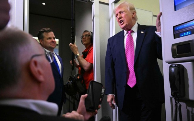 - ▲ 当地时间29日,在从佛罗里达州飞往华盛顿的空军一号上,美国总统唐纳德·特朗普正与记者交谈。/AFP,韩联社