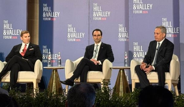 - ▲ 24日,在美国华盛顿特区举行的山谷论坛上,美国国务院副国务卿雅各布·赫尔伯格(左)、白宫科学技术政策办公室主任迈克尔·克拉齐奥斯(中)、白宫人工智能(AI)和加密货币事务戴维·萨克斯登上舞台,进行小组讨论。/华盛顿=金恩中特派记者