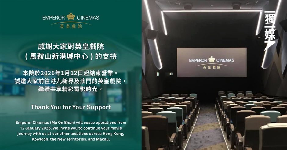 英皇戲院今日於社交媒體宣布,馬鞍山新港城中心戲院即日起結束營業,感謝市民支持,所有由英皇戲院發出的電影禮券、贈券或優惠券,均可於有效期內在香港其他8間英皇戲院使用。而所有原定於馬鞍山新港城中心英皇戲院登記領取的電影禮品,可由2026年1月19日起在英皇戲院Plus+ ( 大圍圍方 ) 領取。