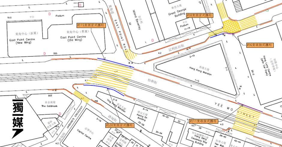 根據文件,當局擬增設60支護柱,當中17支屬收放式,其中11支設於百德新街與怡和街過路處,6支設於百德新街與記利佐治街交界。工程料今年第三季展開,第四季完成。
