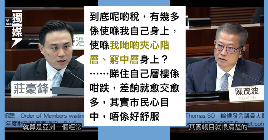 【獨媒報導】特首分別在新一屆立法會宣誓和正式大會前,都有如執法部門長官在行動前作出「訓示」,提醒議員議政不能偏頗,亦督促若不同意政策「請指出問題並提出建議」。新一屆議會運作第三日,實政圓桌莊豪鋒就「實測」水溫,在特別財委會上指出「窮中產」收入不加稅務卻增,質疑「呢啲稅有幾多使喺自己身上」。財政司司長陳茂波反駁指,交通基建、醫療、教育等開支賴以市民稅收,他不能認同「交咗稅完全無得益」。他續指,若議員支持發債,就應在日後政府發債時,多「出嚟解說,講好香港故事」。