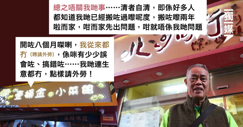 《獨媒》記者找到目前經營大南街275號「壹桶金小菜館」的負責人何先生,他同指對事件毫不知情,強調店舖從未聘請任何外勞。他承認店舖食牌屬於「明哥」,正向食環署申請進行轉名手續。何先生重申今次事件「唔關我事,我係壹桶金,我開咗八個月㗎喇,我從來都冇(聘請外勞),係咪有少少誤會咗、搞錯咗」,「我哋連生意都冇,點樣請外勞!」他指開店至今,廚房亦一直沿用舊班底工作。