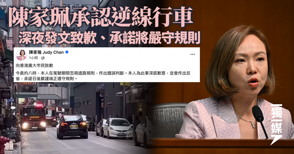 【獨媒報導】Facebook群組「車cam L(香港群組)」周五(23日)流傳一段影片,一輛黑色私家車於灣仔謝斐道逆線行駛,前方更有3輛消防車停泊。新民黨立法會議員陳家珮及後承認是片中涉事司機,又於深夜在社交媒體發文向全港市民致歉,指在駕駛期間忽視道路規則,作出錯誤判斷,並會作出反省,承諾日後嚴謹端正遵守規則。