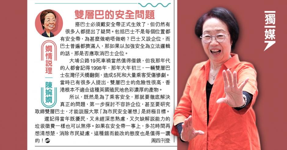 【獨媒報導】強制巴士乘客佩戴安全帶法例早前正式實施,有市民關注帶來的不便。工聯會前立法會議員陳婉嫻在報章撰文,指要徹底解決乘客安全問題,第一步應探討不容許企位,甚至要研究取締雙層巴士。她建議當局參考已擱置的垃圾徵費措施:「多花時間再想清想楚,消除市民疑慮,這種錯而能改的態度也是值得一讚的!」