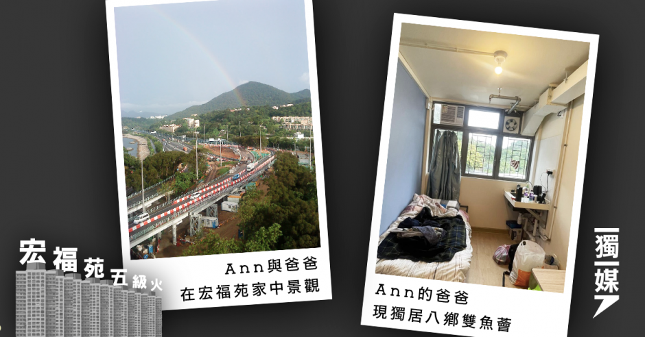 Ann 的父親是單位的一手業主,災後大埔的過渡性房屋早已爆滿,Ann 因工作地點考慮,借宿朋友位於鑽石山的家,父親則因信奉基督教,實地考察後選擇入住路德會營運、位於元朗八鄉粉錦公路沿線的雙魚薈。