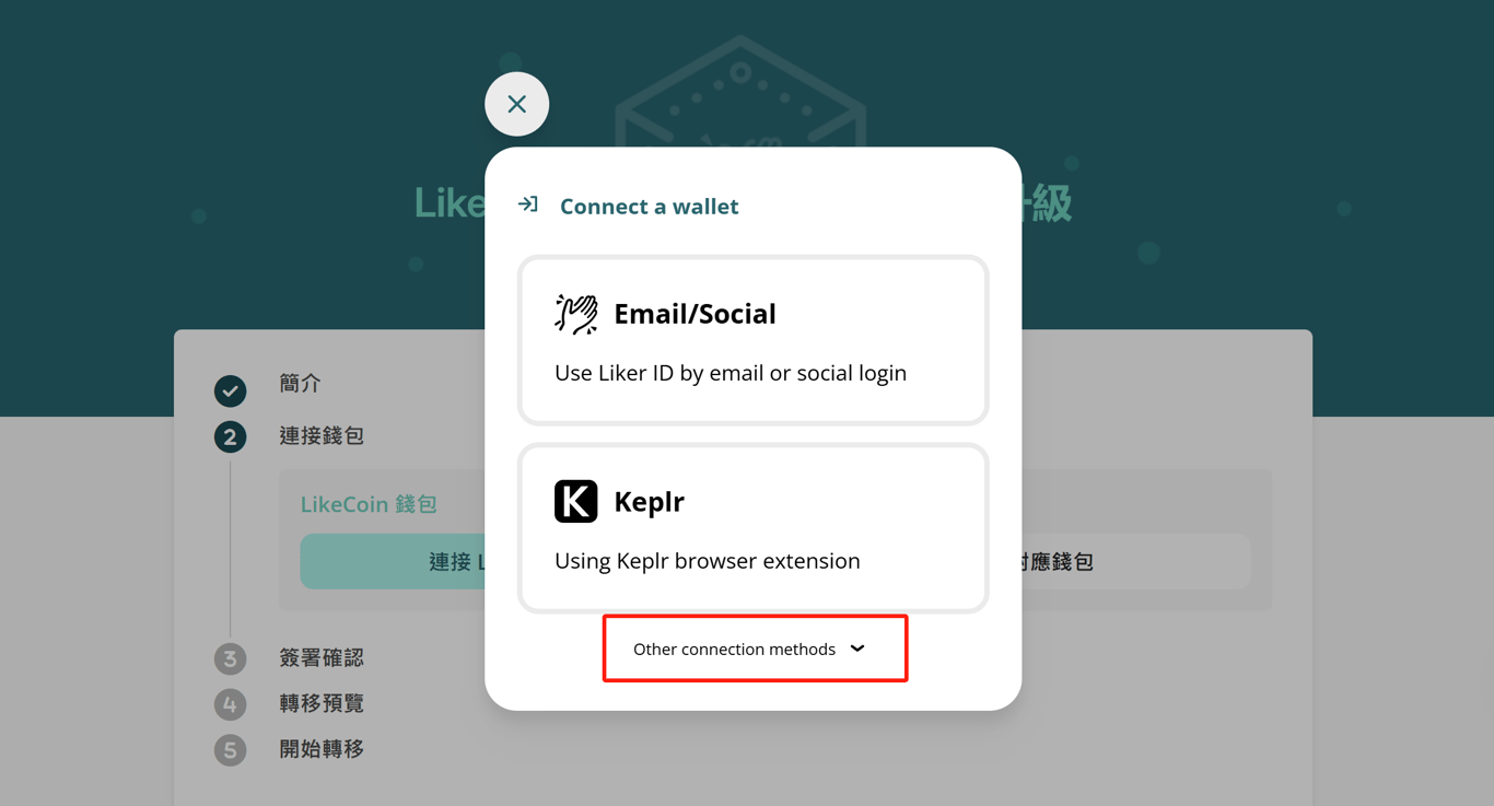 第二步,打开v3-token-migration.l...kecoin钱包(V2)”,然后在下图界面上选红框内的“Other connection methods”。