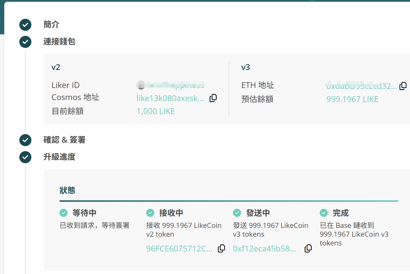 第四步,在上面“第二步”那个界面再点“连接对应钱包(V3)”,用你在“第一步”注册的邮箱登录,登录完成它就自动开始升级,几秒之后你就会看到类似如下显示。也就是说,升级成功了。