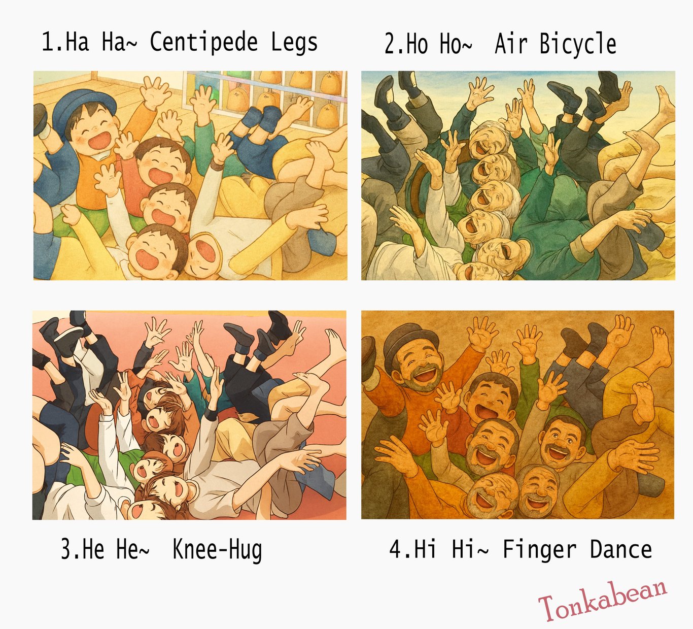 筆記裡的(蜈蚣笑)一直讓我很好奇。這個需要大家頭碰頭、腳朝外躺成圓圈的動作,在線上課裡從沒試過,鏡頭實在拍不到。