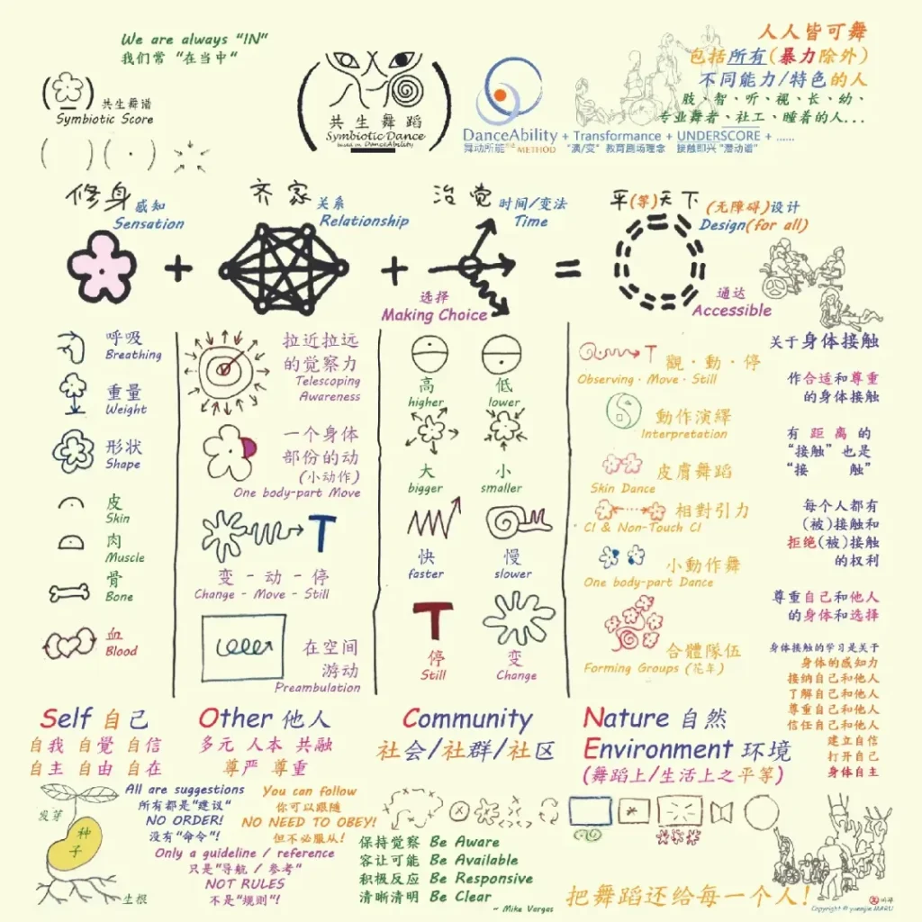 释文:我参加这次的论坛之后,在看到每一个人分享的观点,又让我深入思考了一下我理解的“残障”、“障”是什么,以及残障和我的关系。共生不错舞团的愿景非常大,是希望以残障为线索去推动人人平等。但当我和丸仔讨论在论坛上关于“健全中心主义”问题的回答时,他认为我们现在做的事情就是“去健全中心主义”的,我们这些残障的伙伴都出来让大家看到我们是存在的,这样才能真的去除所谓的“健全中心主义”,例如盖房子时都能想到不方便爬楼梯的人怎么上楼。就我自己的理解而言,我更大的一个愿景还是希望在未来真的可以达成一个人人平等的环境。共生舞就是从圆圈开始、从圆圈结束,没有一个人在前,也没有一个人在后。每个人可以相互看到的,没有一个人不被看到,无论是老师还是任何一个参与者,每个人都是分享者和共创者。我觉得这是我体验、实践共生舞这几年来一个很棒的事情,就是相互看到、彼此成就,共同创造。我一直有热情推动这个理念,也是因为我渴望这样的一个世界,虽然在我有生之年未必能完全实现。