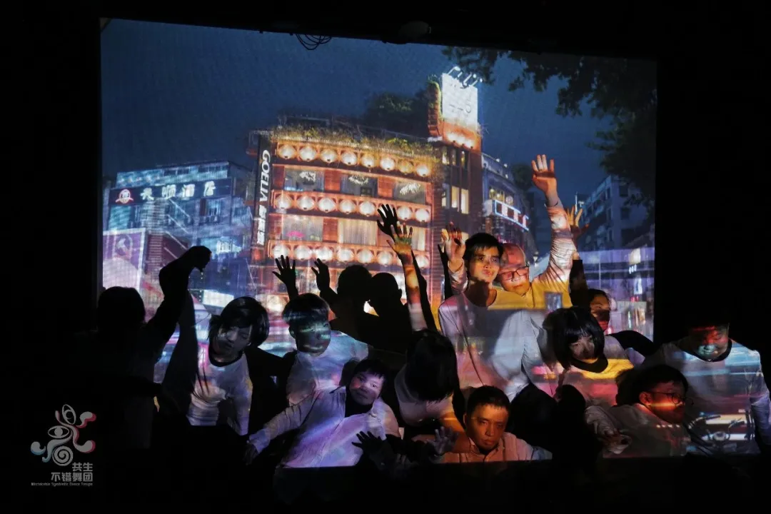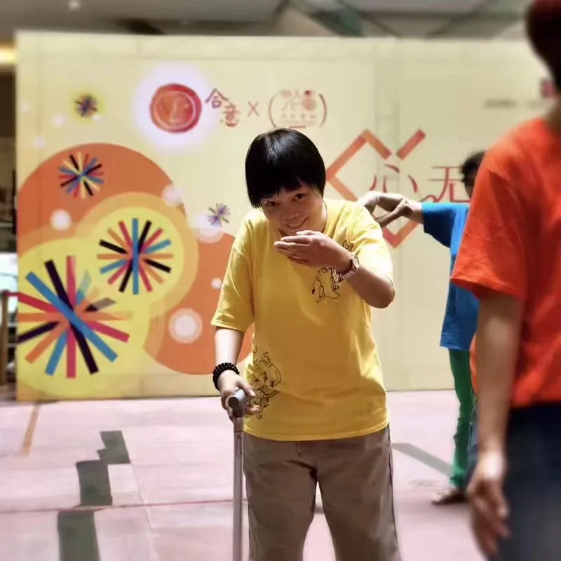 我纠结了几天之后,还是决定报名。活动刚开始的阶段,我会把助行器放在一边,自己慢慢走动。工作坊的伙伴们也帮助和保护我,当时就甩掉了助行器。这是一个为期三天的工作坊,第四天上午还有一场演出,我还做了一个主角。演出当天,忘记了是经过了一番怎样的挣扎后,我最终还是带着助行器上台去表演。结束后,我感到非常开心,尽管带着助行器,我仍完成了这一挑战,对我来说是一次巨大的突破,整个人都感觉是一个挺好的状态。邀请我来恭明中心实习的同事,当时也是艺术项目的工作人员,他说:“我很期待你来参加共生舞。”我当时很疑惑:跳舞不是需要手脚都用上吗?我现在脚走成这个样子,手还要拿着助行器。等于我双手双脚都用不上,我怎么跳舞呢?我说:“我这样子可以跳舞吗?”他说“可以的,很期待你的参加。”